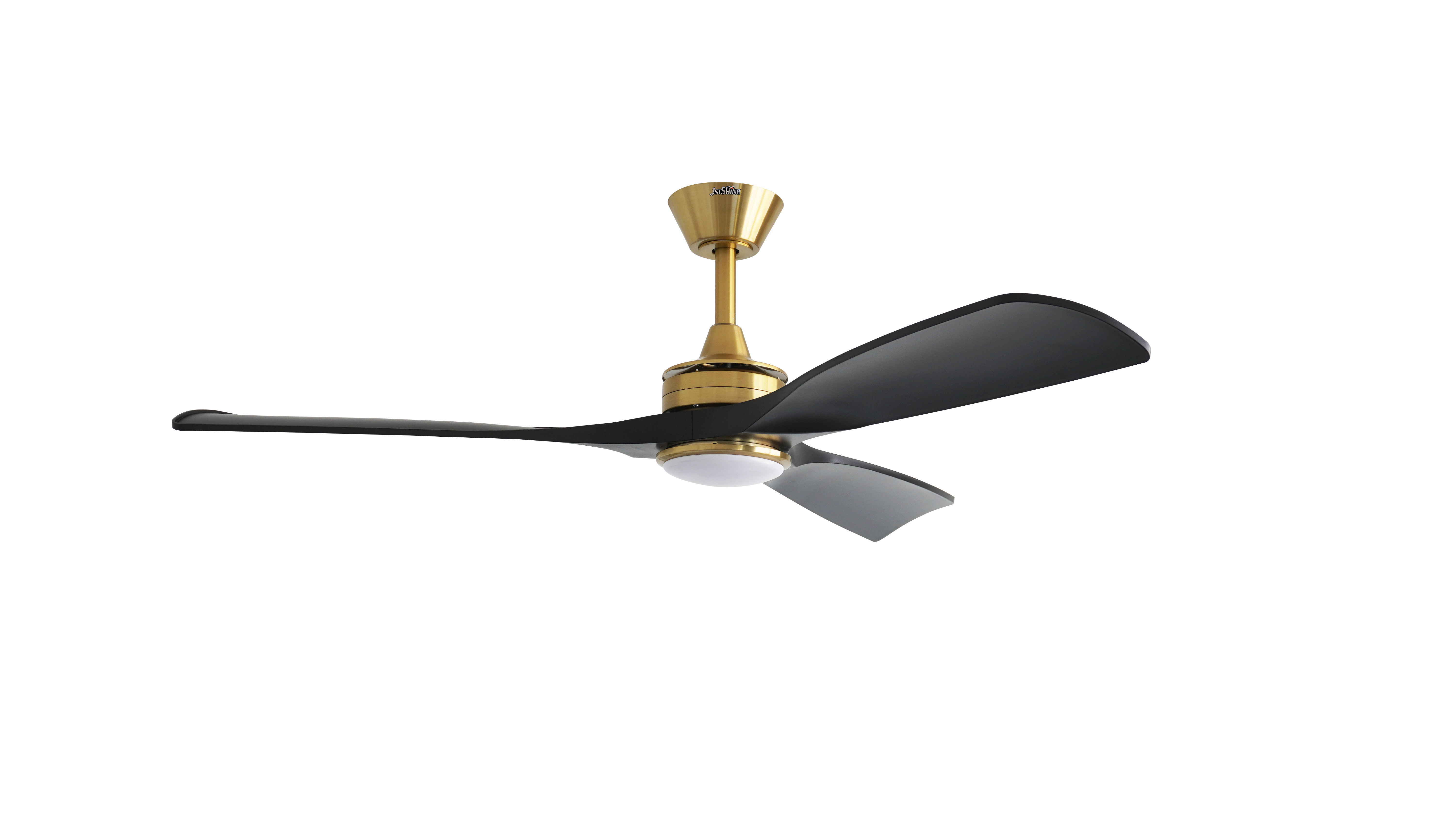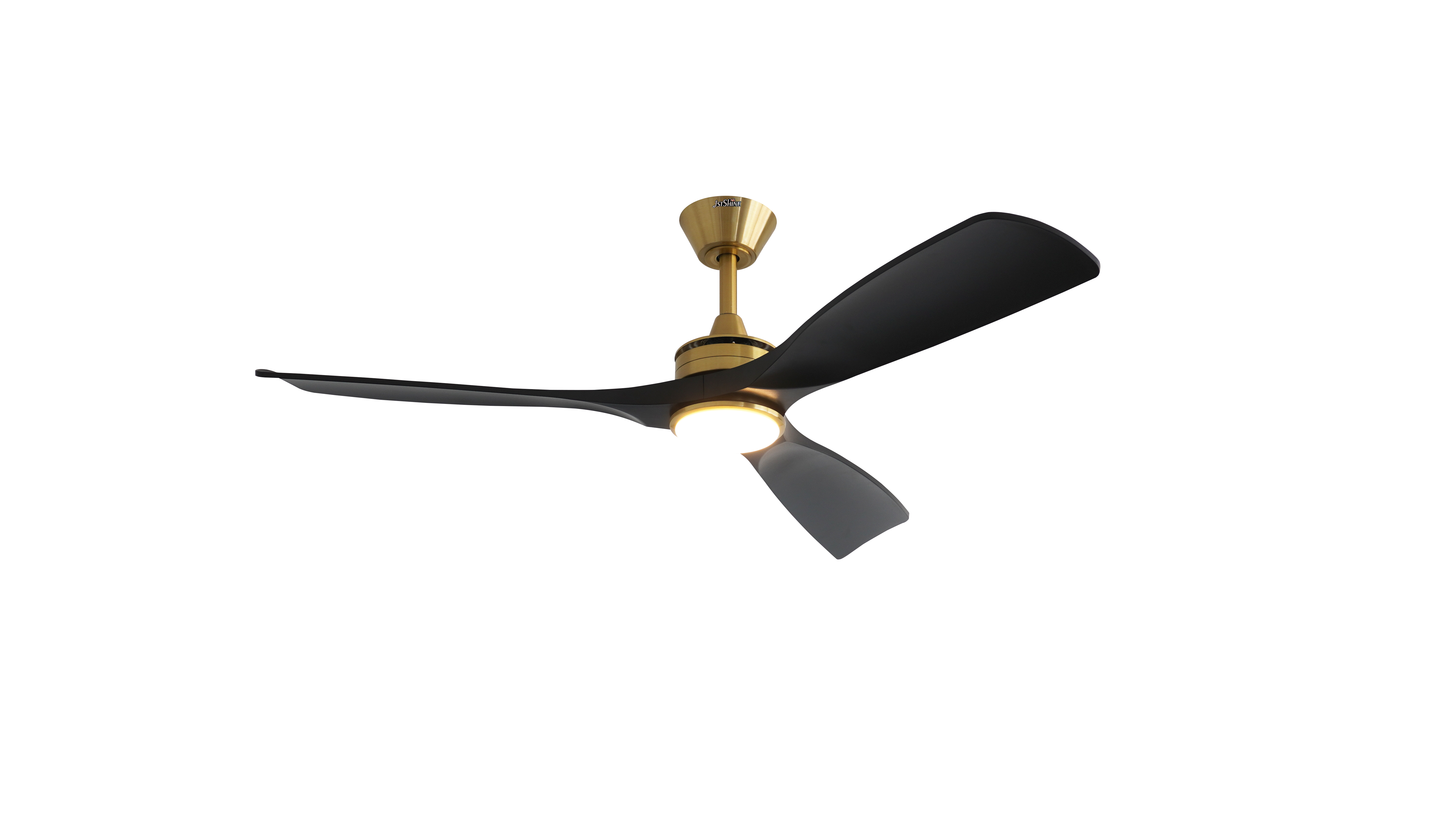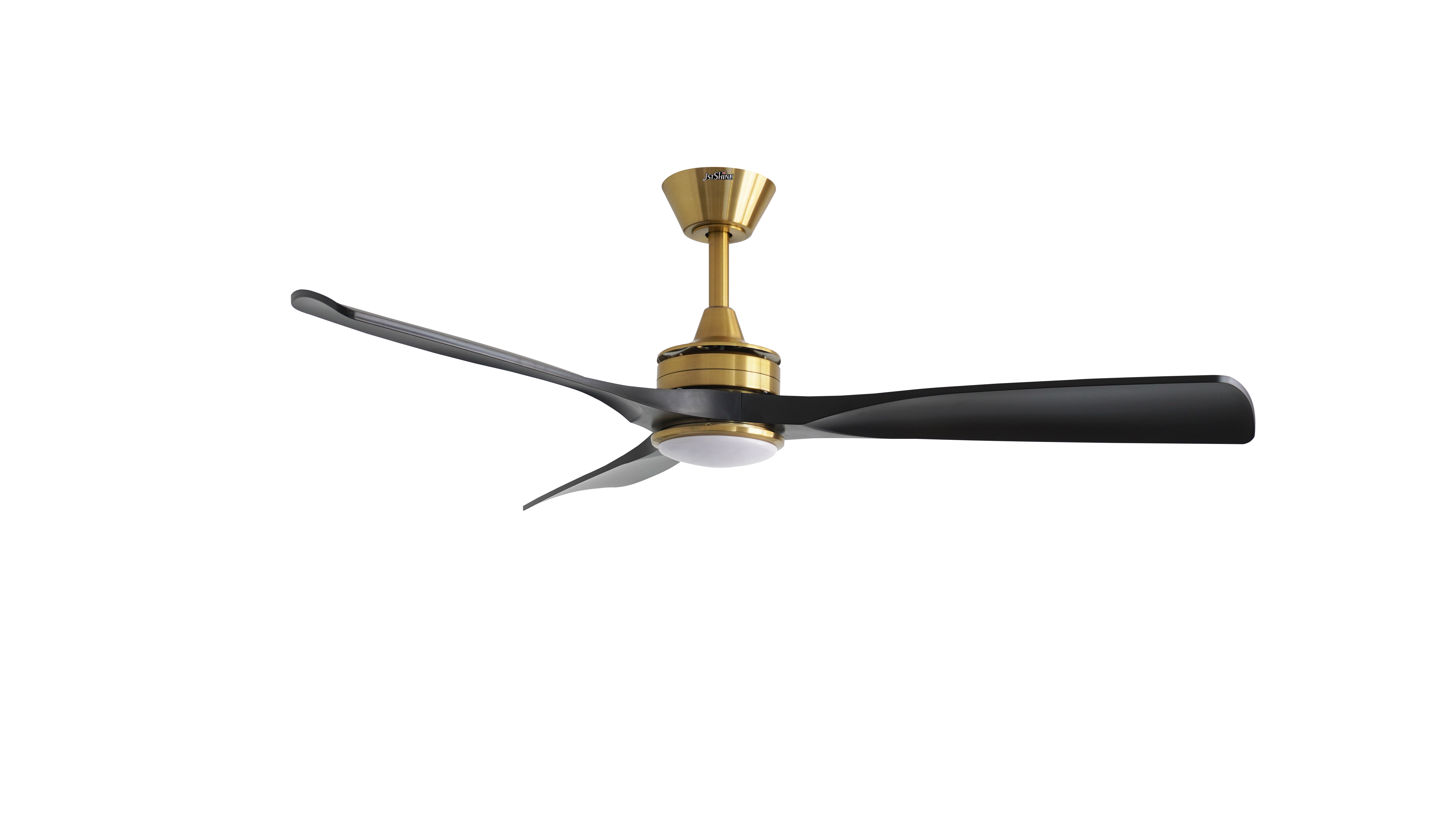 Command high spaces with our aerospace-inspired downrod fan. Featuring gold-finish body, tri-blade aerodynamics, and infinitely adjustable rods . Engineered for vaulted ceilings up to 15° slope. Where performance becomes ceiling sculpture.
